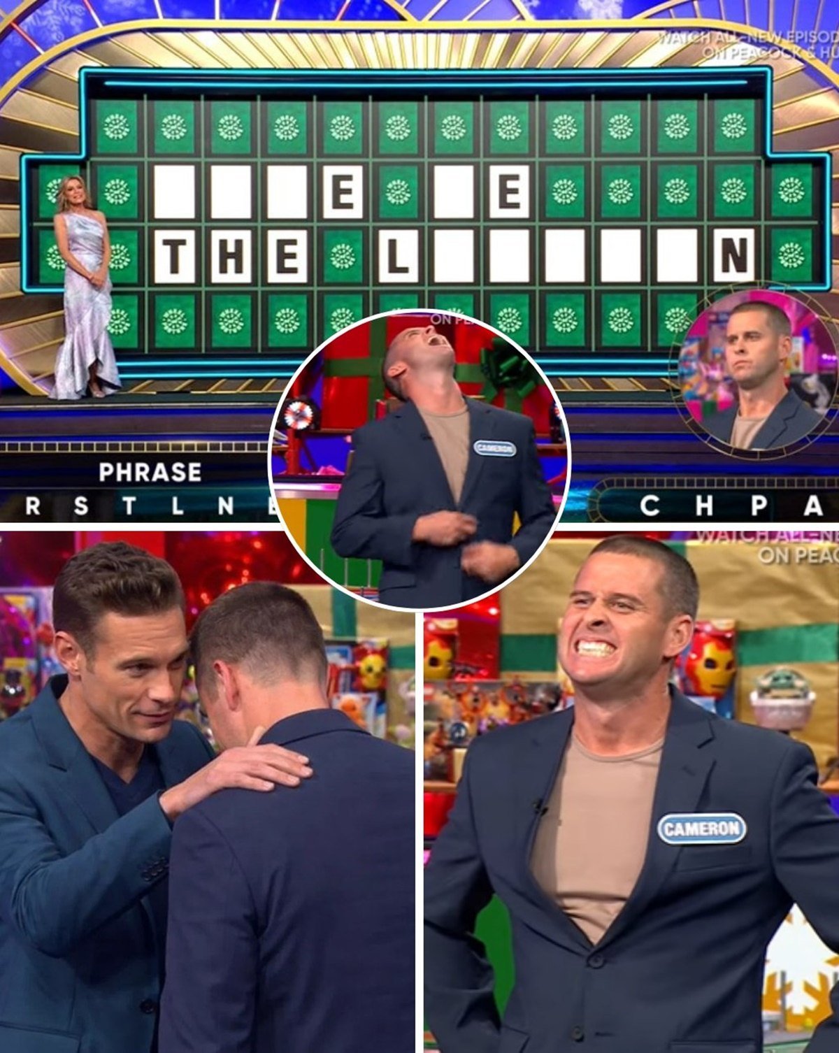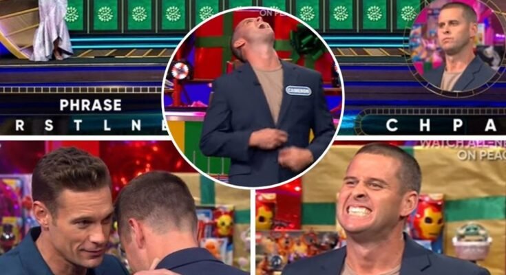 Cameron has already won a significant amount of money. During the bonus round, he spun the wheel, aiming for big money, potentially $100,000. “We got $100,000 on there. That would be big,” Seacrest said. Cameron chose the “Phrase” category and had the standard letters R, S, T, L, N, and E revealed on the puzzle board. Cameron then chose C, H, P, and A as additional letters.