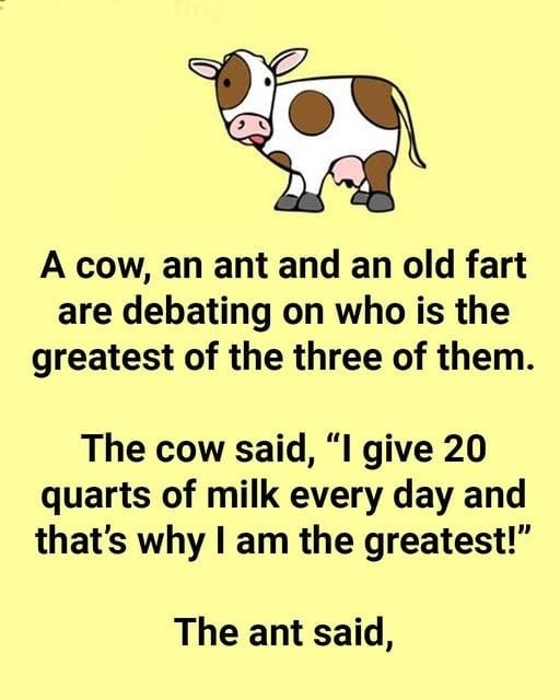 A cow, an ant and an old fart are debating on who is the greatest of the three of them.