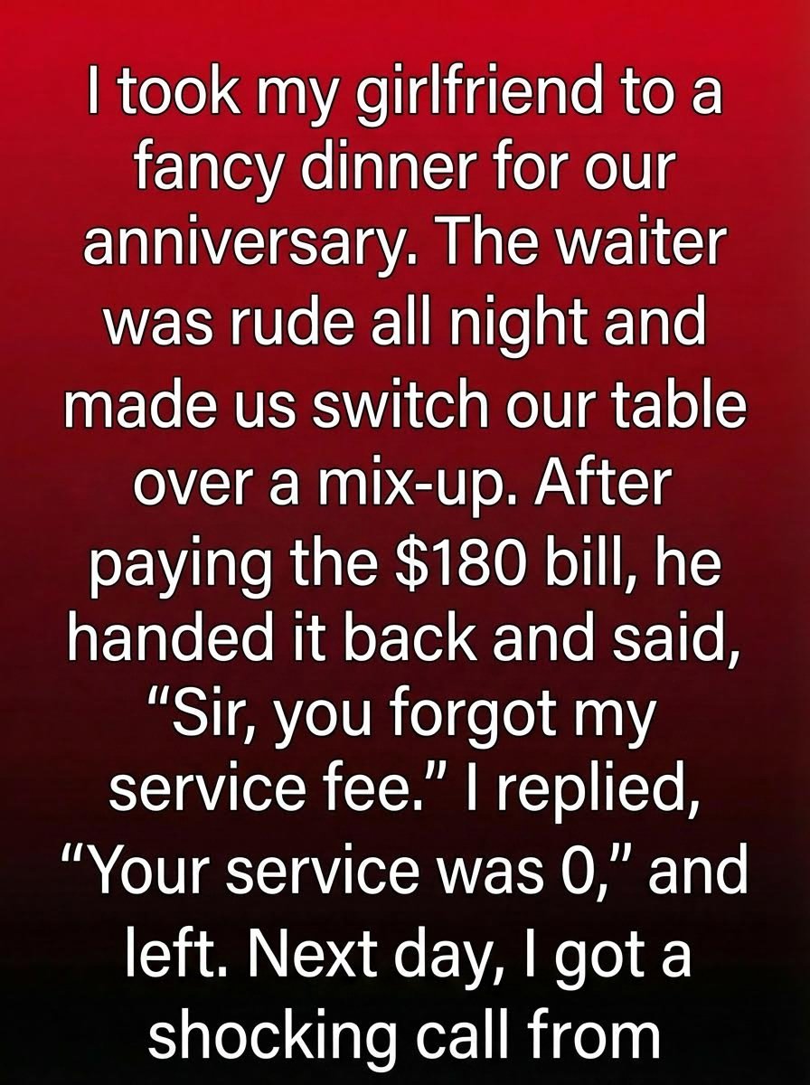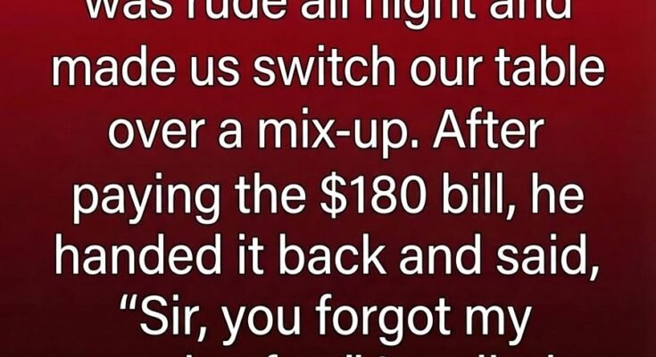 Without raising my voice, I responded honestly. I said his service felt like nothing at all, and I left. At the time, it wasn’t about revenge or pride—it was about boundaries. I walked out feeling conflicted, unsure whether I had stood up for myself or simply let frustration speak. The night ended quietly. My girlfriend and I talked on the drive home, not about the waiter, but about respect—how it shows up in relationships, in work, and in everyday interactions. We agreed that moments like these reveal more about who we are than about the inconvenience itself.