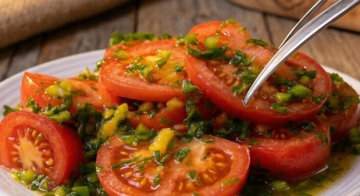 At first glance, this tomato salad looks almost too simple to be memorable. There are no complicated techniques or long ingredient lists, just ripe tomatoes and a fresh green dressing. Yet one bite quickly explains why so many people return to it again and again. The combination of juicy tomatoes and a fragrant mixture of herbs, garlic, olive oil, and gentle acidity creates a dish that feels vibrant and complete. It’s refreshing without being plain, bold without being heavy, and satisfying in a way that sneaks up on you. This is the kind of recipe that proves great flavor doesn’t require complexity—only thoughtful balance.