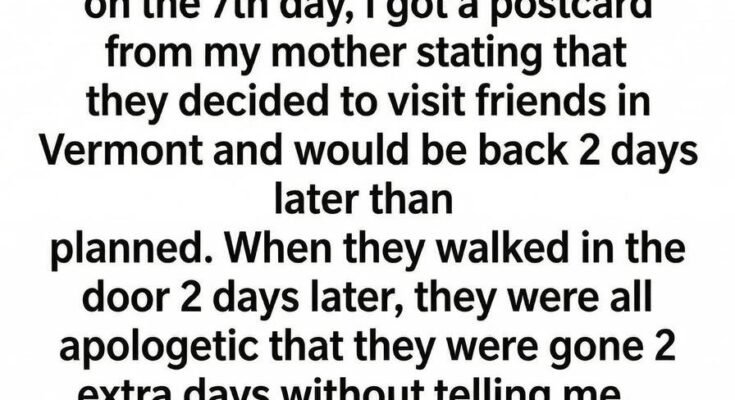 Those extra days passed slowly. I carried the postcard in my pocket, rereading it during breaks, grounding myself in the familiar curve of her words. When my family finally walked through the door two days later, they looked tired but happy—until they saw my face. I teased them about extending the trip without calling, holding up the postcard like proof. My father frowned. My siblings exchanged looks. My mother laughed at first, then stopped. She told me they hadn’t sent anything. No postcard. No Vermont stop. They had driven straight back from Canada, exactly as planned.