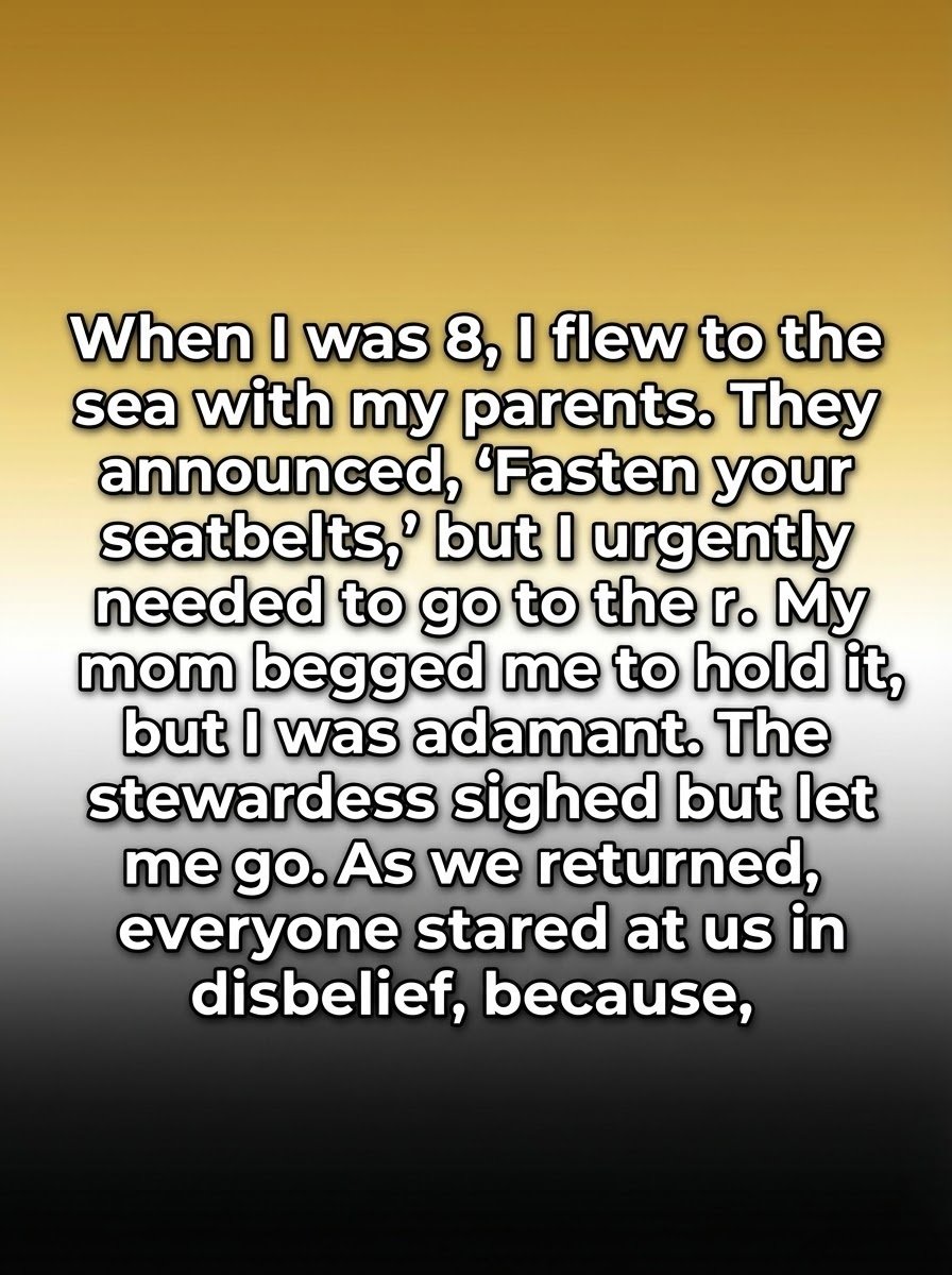 When I was eight, the world still felt elastic, as if rules could stretch if you pulled on them hard enough. That day, the plane hummed with a strange excitement as it traced a silver line toward the sea. The captain’s voice floated down the aisle, calm and official, asking everyone to fasten seatbelts. My parents obeyed, clicking theirs into place like punctuation at the end of a sentence. But inside me, another urgency spoke louder. I remember gripping my mother’s sleeve, insisting I needed to go right then, not later, not soon—now. Her eyes searched my face, half worry, half apology, as if she were choosing between gravity and mercy.