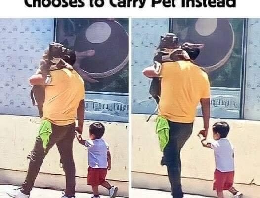 The father’s choice to carry his dog instead of his son has caused a lot of interest online. A woman filmed the strange moment from her car and shared the video on her TikTok profile.